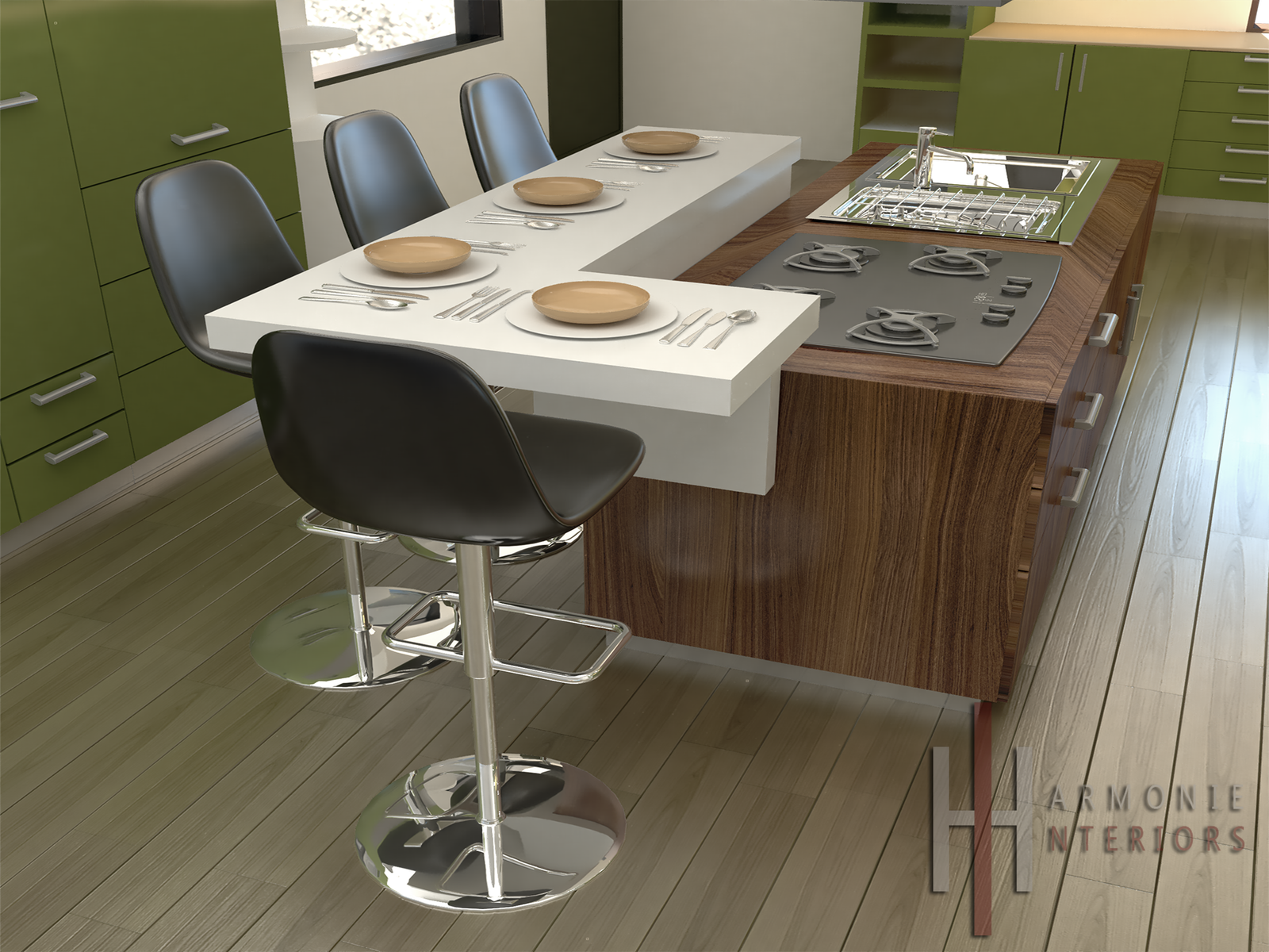 مطبخ عصري حيث تلتقي الوظيفة بالجمال مطبخ عصري مفتوح يجمع بين الطابع العملي والأناقة المعاصرة. تتألق الخزائن باللون الأخضر الزيتوني الجريء لتضفي حيوية ودفئاً على المكان، بينما تتناغم مع أسطح العمل البيضاء الناصعة وتفاصيل الخشب الطبيعي بلونه البني الدافئ. تتوسط المطبخ جزيرة متعددة الاستخدامات تجمع بين مساحة للطهي مع موقد مدمج وحوض، وطاولة طعام بيضاء ممتدة تتسع لأربعة أشخاص مع كراسي بار أنيقة بتصميم عصري. يوفر التصميم مساحات تخزين واسعة موزعة بذكاء، مع أجهزة مدمجة تشمل فرناً وشفاط هواء معلق يكمل الطابع الصناعي الأنيق. الأرضية الخشبية الفاتحة والإضاءة الطبيعية المتسللة من النوافذ تمنح الفراغ رحابة وإشراقاً، ليصبح المطبخ قلب المنزل النابض ومكاناً مثالياً للطهي واللقاءات العائلية.
