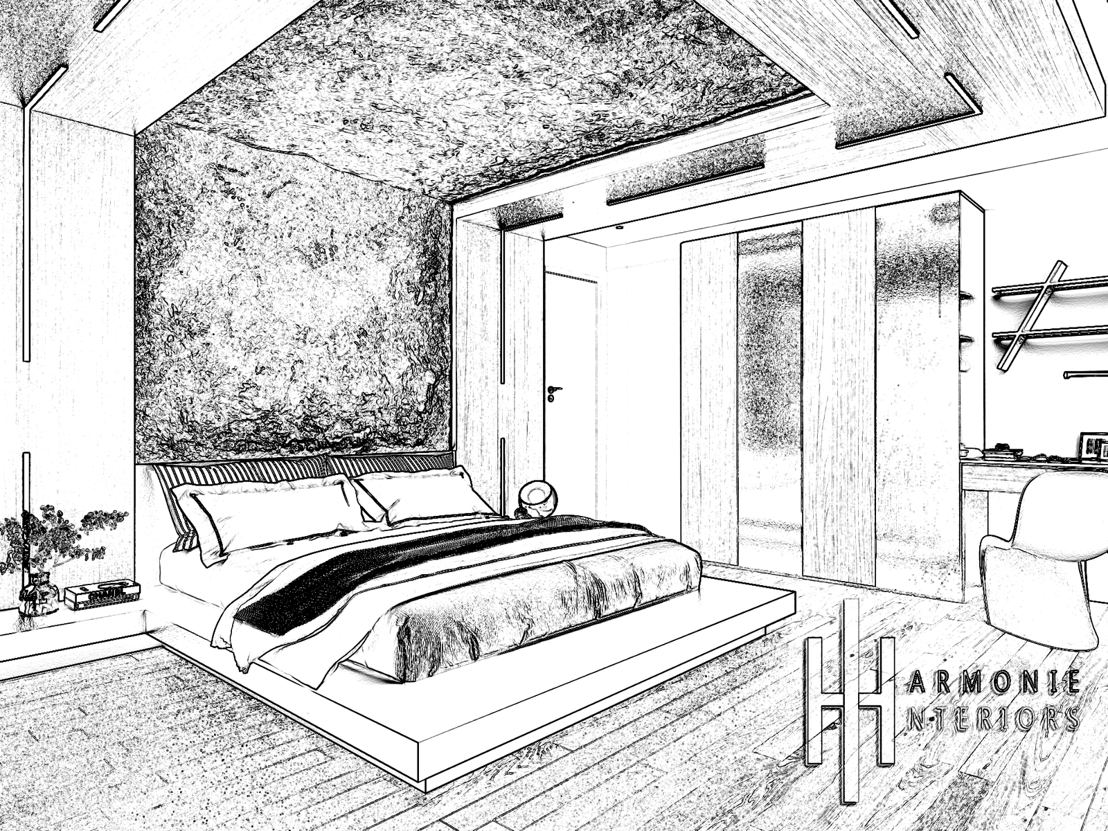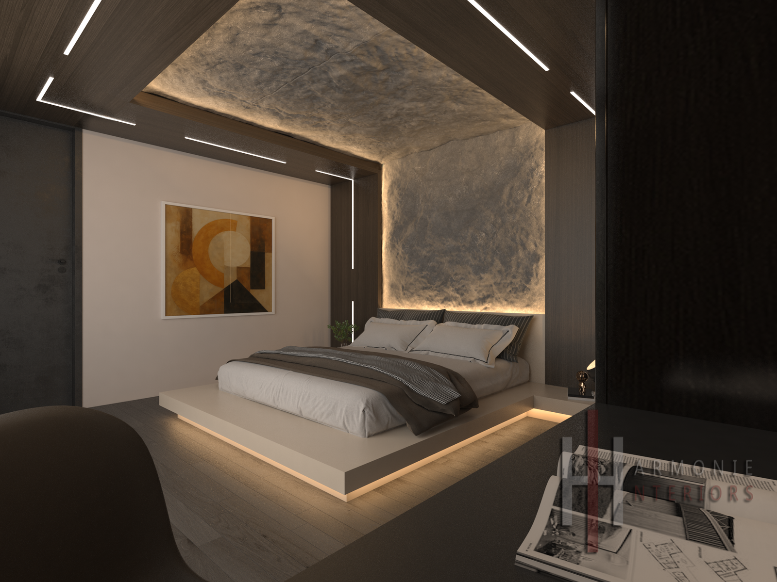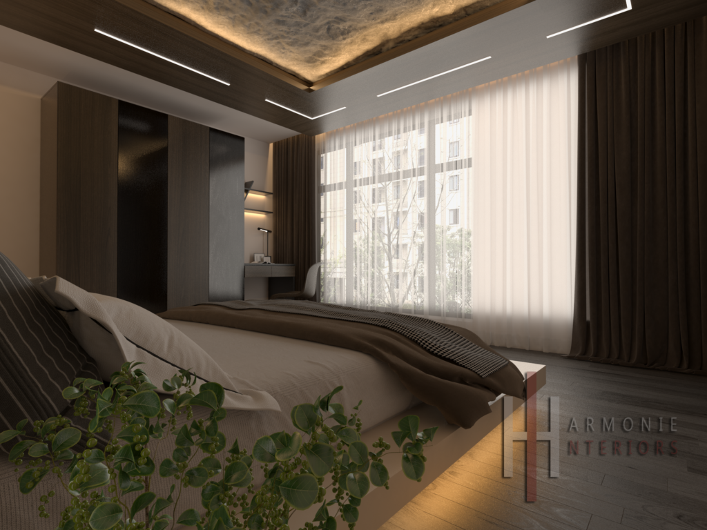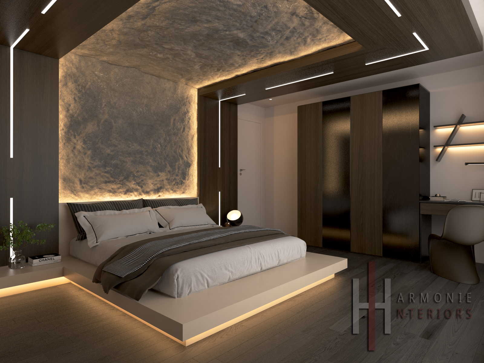 Hauptschlafzimmer Eine Oase der Ruhe und des Luxus Ein Design, das Komfort und Eleganz neu definiert. Der Raum wird von einer hinterleuchteten Natursteinverkleidung dominiert, die sich vom Kopfteil bis zur Decke erstreckt und eine warme Atmosphäre schafft, die das sanfte Licht der Morgendämmerung nachahmt. Das Bett ruht auf einem schwebenden Sockel mit verdeckter Beleuchtung, der dem Raum ein Gefühl von Leichtigkeit und Tiefe verleiht. Dunkle Holzvertäfelungen fügen sich harmonisch in die LED-Lichtleisten ein, die in präziser geometrischer Anordnung über die Decke verlaufen, während Vorhänge und Grünpflanzen einen Hauch von natürlicher Wärme verleihen. Das Design umfasst eine eigene Arbeitsecke und einen Kleiderschrank mit dunklen Glastüren, die das Licht elegant reflektieren. Ein Raum, der mehr als nur ein Ort zum Schlafen sein soll, sondern ein Raum der Besinnung und Entspannung, fernab vom Trubel des Alltags.